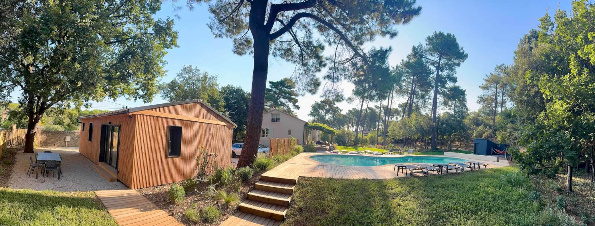 Le lodge comprend deux suites parentales avec salles de bain privatives, un espace de vie convivial aux accents boisés, une cuisine entièrement équipée et une grande terrasse ouvrant sur le jardin.